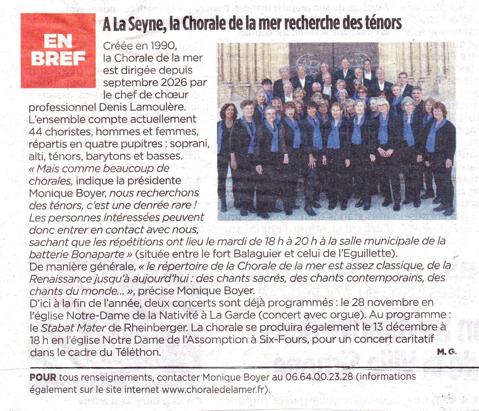 Concert à La Valette Article paru dans VarMatin du 18 novembre 2011. "...La Chorale de la Mer, des voix de femmes et d'hommes à vous donner des frissons, a été chaleureusement applaudie."... |